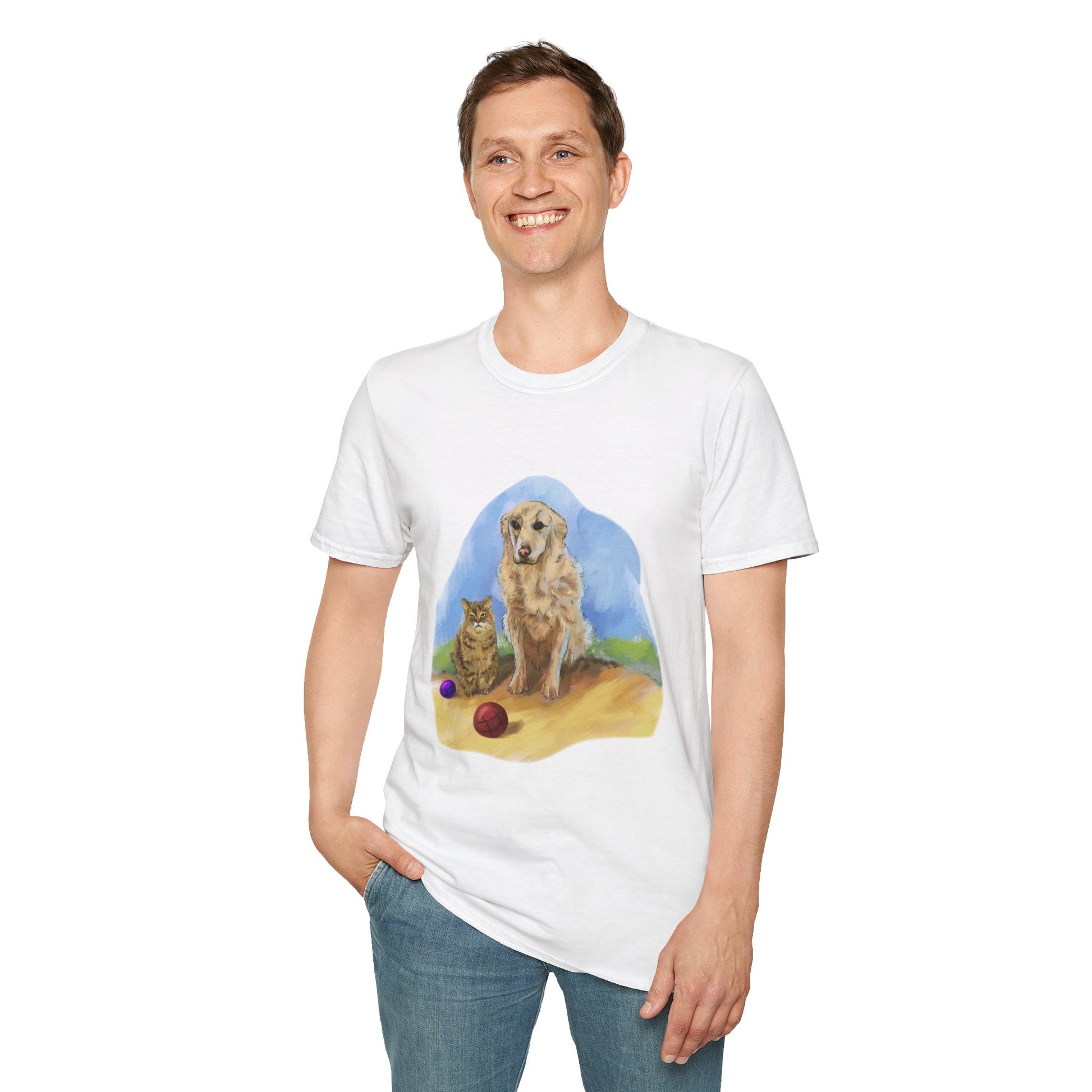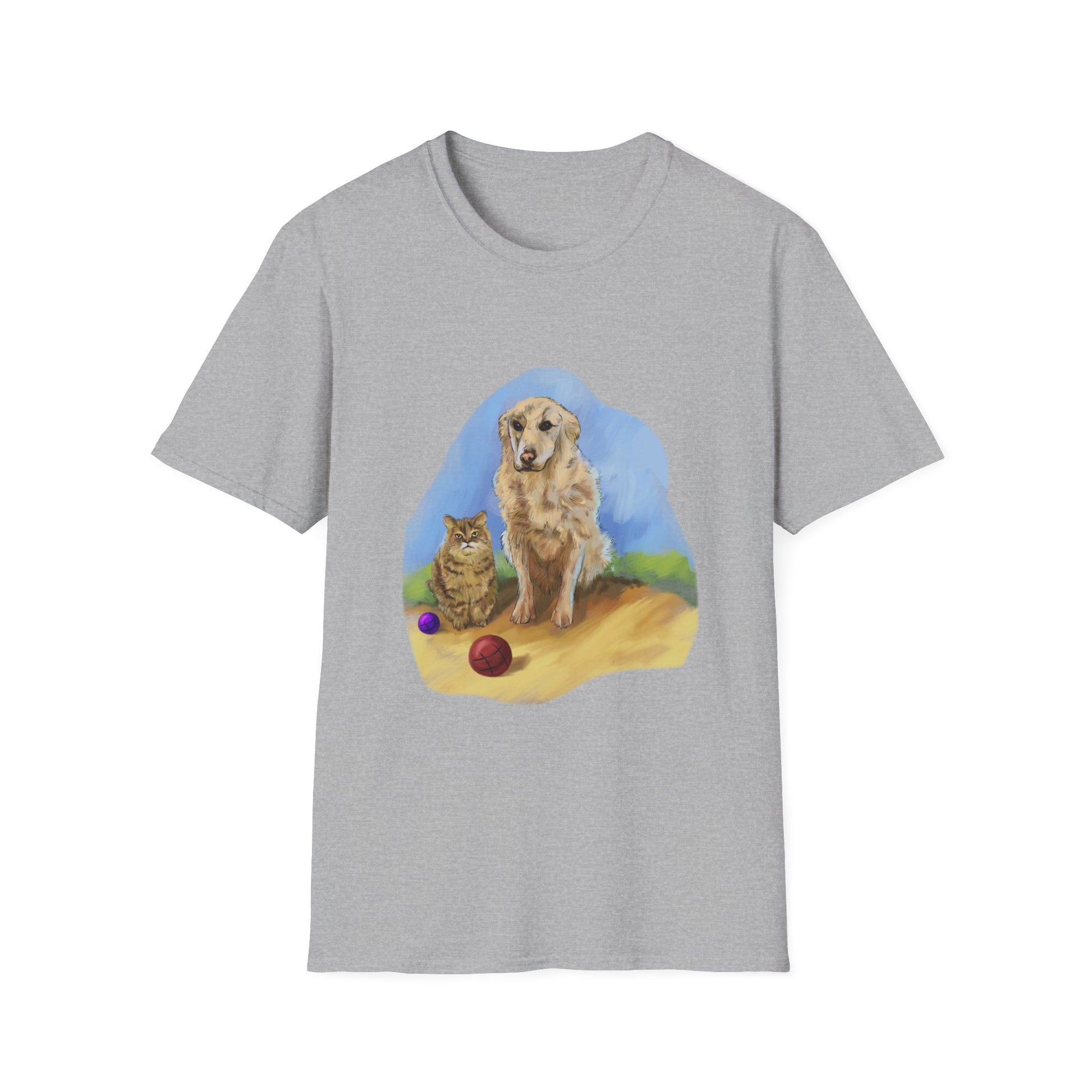Introducing a unique and heartwarming t-shirt design featuring "Futu" the loyal dog and "Wally" the moody cat. This custom artwork, unlike typical graphic designs, is a beautifully detailed painting that captures the tender bond and unspoken love between these two companions as they patiently wait for their beloved father "Ron" to come home. The rich, textured brushstrokes bring Futu and Wally to life, making this t-shirt a wearable piece of art that celebrates their enduring connection and the joyful anticipation of reunion.